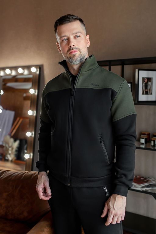 Верх - толстовка на молнии с высоким воротником-стойкой. Контрастная вставка в верхней части делает образ динамичным и визуально подчёркивает плечи. Рукава и низ изделия с эластичными манжетами, что обеспечивает удобную посадку и защиту от продувания.