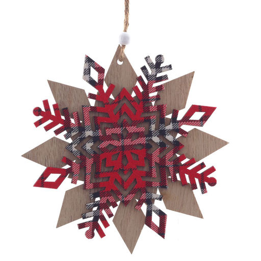 Новогодняя деревянная игрушка в форме снежинки внесет теплые нотки в убранство праздничной ели. Украшение представлено в трех вариантах.