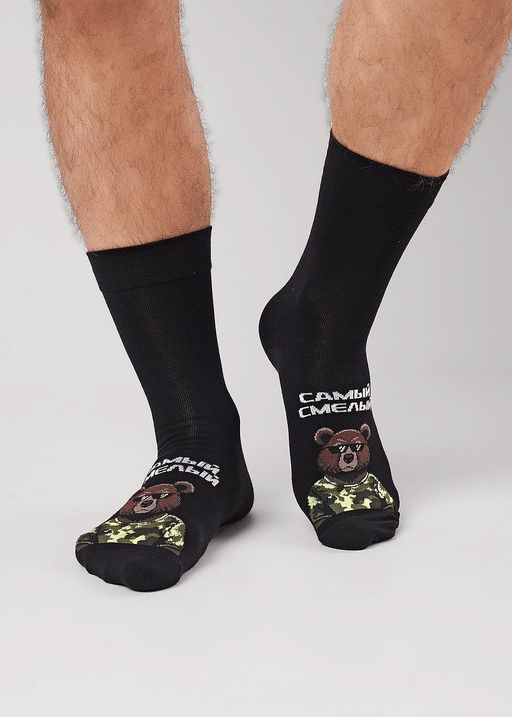 Мужские носки с рисунком на мыске и надписью "Самый смелый". Выполнены из хлопкового полотна с добавлением полиамида и эластана. Прочная и эластичная ткань приятна для тела, прекрасно пропускает воздух, не электризуется и подходит для чувствительной кожи. Добавка эластана в мужские носки придает им эластичность и гарантирует, что они не потеряют цвет даже после множества стирок. Мягкие удобные носки отлично подходят для повседневного использования, занятий спортом и активного отдыха. Состав: 70%Хлопок25%ПА 5%Эластан