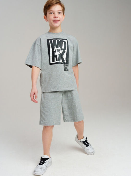 Костюм для мальчика подростка. Комплект оверсайз: футболка, шорты с высоким содержанием хлопка 95%. Благодаря наличию эластана в составе ткани изделие проще в уходе и держит форму. Шорты на резинке со шнурком. Боковые карманы. Модель выполнена из качественного и приятного на ощупь трикотажа.­