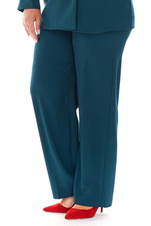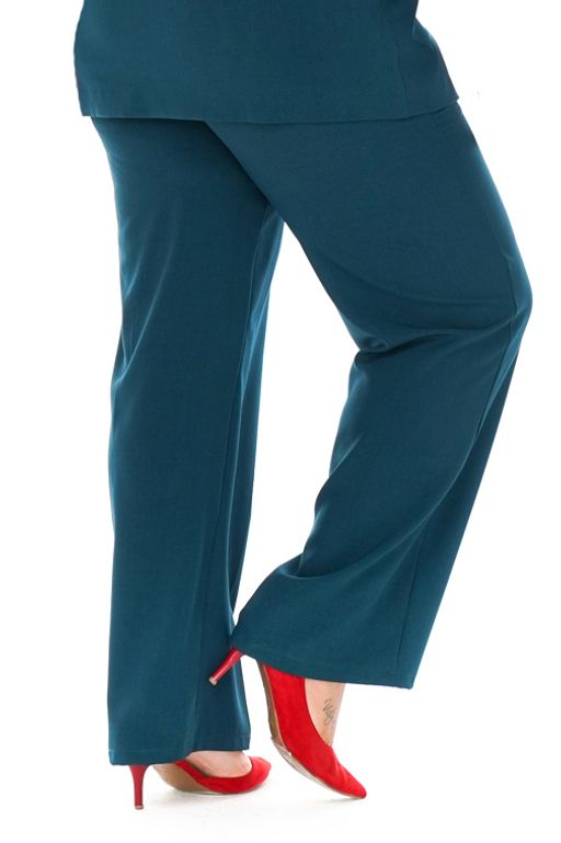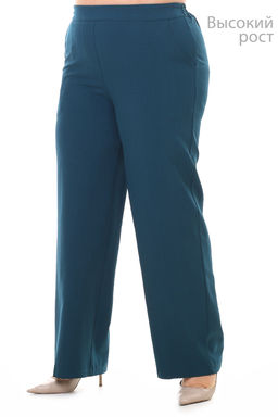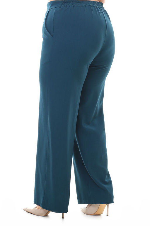 Брюки классического кроя отлично сидят за счет комфортной резинки на поясе по спинке. По бокам практичные карманы. Модель привлекает внимание широким клешем книзу. Брюки прекрасно подойдут для комбинирования с водолазками, свитерами, блузками,  рубашками и жакетами. Эти модные брюки станут идеальным вариантом для создания стильного образа.
