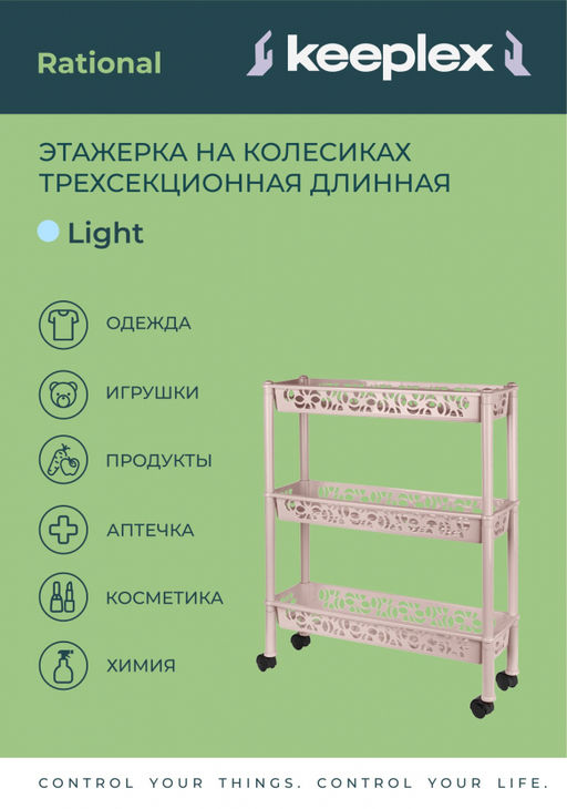 Этажерка Keeplex на колесиках трехсекционная прямоугольная длинная 58х18х69 см - это эффективное и недорогое решение для организации хранения в небольших помещениях, на кухне, в ванной, на балконе или лоджии, в кладовой или на даче. Отличительная особенность этажерки - она узкая и вытянутая, отлично экономит пространство, ее ширина всего 18 см. Напольная этажерка состоит из трех полок с небольшими бортиками. Габариты этажерки в собранном виде 580х180х690 мм, она собирается без инструментов за несколько минут, достаточно соединить стойки и полки, вставить ножки и заглушки. На нижних ножках предусмотрены колесики, ее легко выдвигать и устанавливать на место.