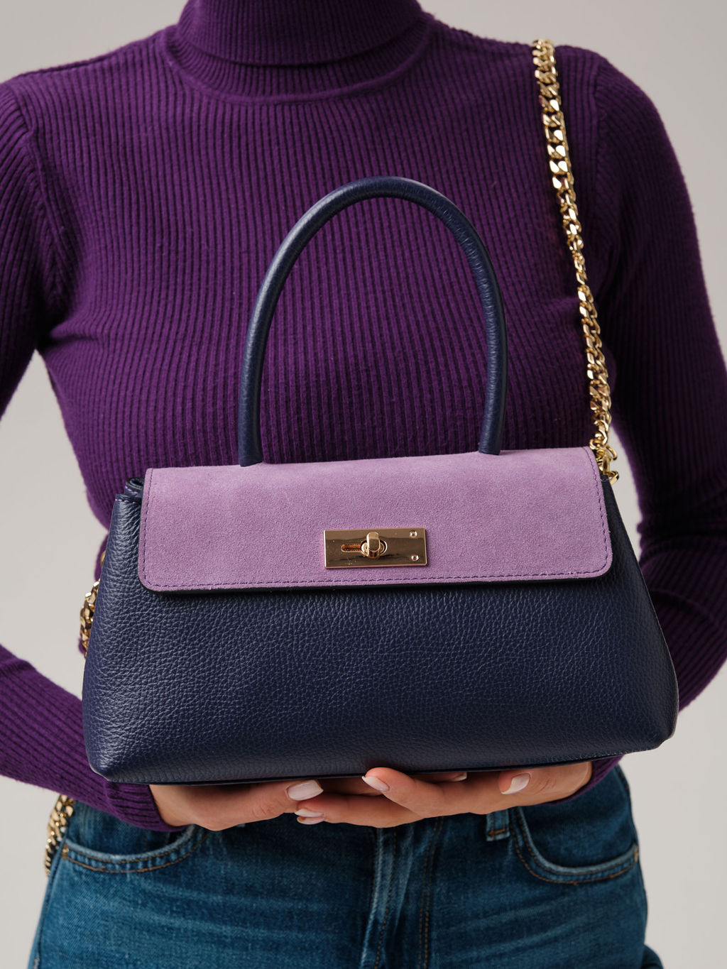 Детали: натуральная кожа, натуральная замша, кожаная ручка, съемный нерегулируемый ремень-цепочка с кожаной вставкой, 2 внутренних отделения на хлопковой водонепроницаемой подкладке, 1 внутренний закрытый карман на молнии, клапан с внутренней отделкой из натуральной замши и застежкой на замок-вертушку, металлические ножки.­