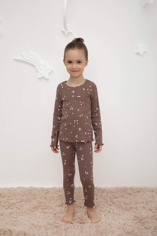 Трикотажная пижама в рубчик из натурального хлопка. Джемпер с длинными втачными рукавами. Бриджи с удобным эластичным поясом на резинке. Оригинальная набивка выполнена из стойких, гипоаллергенных текстильных красителей. Комплект сохраняет цвет и форму после многократных стирок. Все трикотажные полотна производятся в соответствии с нормами Швейцарского сертификата ЭкоТекс.­