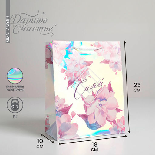 Плотность, г/м²: 190. Допустимый вес вложения, г: 700. Тематика: Цветочно-растительная. Тематика праздника: Универсальная тематика. Тематика праздника: 8 Марта. Отделка пакета: Голография. Вид ручки: Ручка-шнур. Особенности: Без особенностей. Бесплатная доставка: Да. Наша разработка: Да. Размеры товара: 10/23/18.