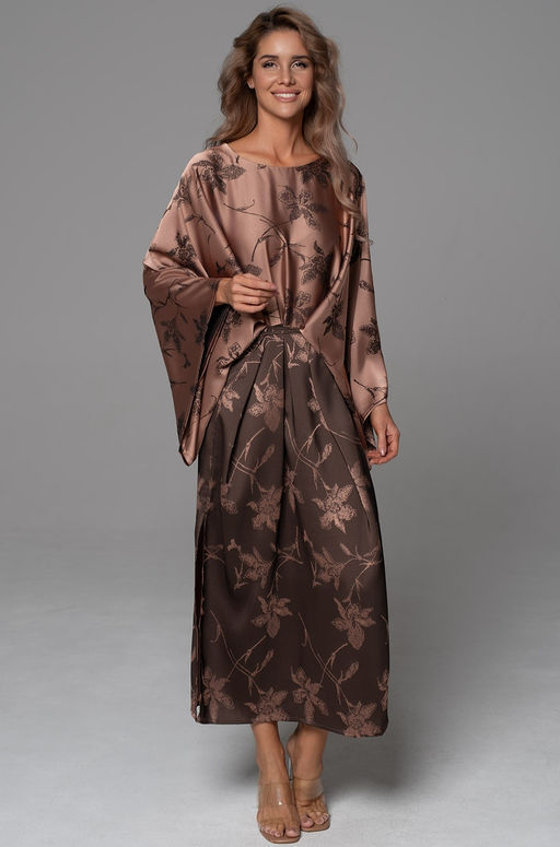 Туника свободного силуэта Mia-Amore ниже колен, с O-образным вырезом горловины выполнена из жаккардового двухцветного смесового шёлка. Верхняя часть выполнена из светлого жаккарда, нижняя часть - из тёмного шёлка. По талии туника приталена с помощью вшитых завязок. Состав: 58% натуральный шёлк, 42% вискоза