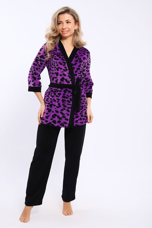 Домашний костюм состоит из укороченного халата и брюк. Брюки с карманами. Халат запашной на поясе. Рукава длиной 3/4 с манжетами. Карманы в боковых швах.