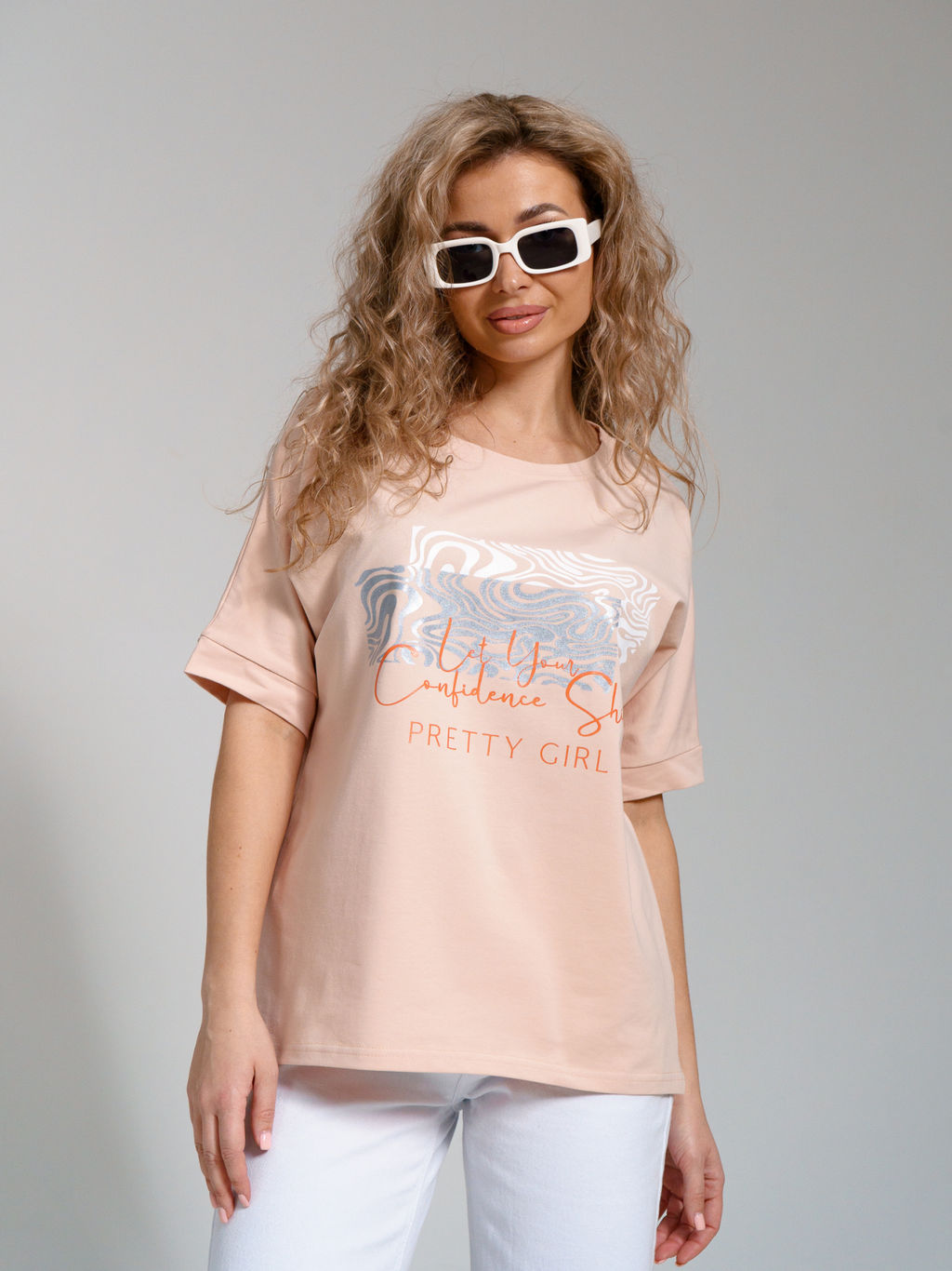 Обратите внимание: фото изделия сделано при искусственном освещении в студии, вживую - цвета могут немного отличаться. Стильная туника выполнена из высококачественного трикотажного полотна (кулирка с лайкрой пенье).Модель прямого силуэта со спущенной линией плеча, рукав втачной. Перед декорирован авторским принтом. Спинка цельнокроеная. Манжеты на рукавах. Яркая офисная туника  свободного кроя, напоминающее длинную футболку, прекрасно подходит для носки каждый день дома или на даче. Удлиненная трикотажная, есть большие размеры. Подойдет вам как домашняя так и для офиса, она гигроскопична и быстро сохнет. Платье туника для беременных, будущих мам, кормящих женщин, в роддом и на выписку. В ней можно отдыхать и заниматься домашними делами, а при необходимости в теплое время и добежать до магазина или погулять с ребенком около дома.
