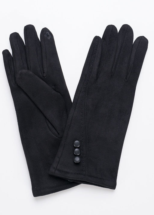 Женские перчатки из искусственной замши, декорированы отстрочкой и кожанными пуговицами, на большом и указательном пальцах вышивка сенсорными нитками, размер 18. 91% пэ, 9% эластан