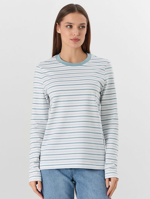 Джемпер женский в полоску это лёгкая и лаконичная вещь для повседневных образов. Он выполнен из мягкой трикотажной кулирки, которая обеспечивает комфорт и хорошую воздухопроницаемость в течение всего дня. Прямой силуэт с круглой горловиной и длинными рукавами на манжетах создаёт универсальный и аккуратный вид.