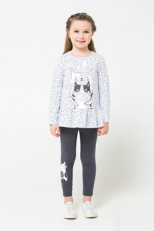 Комплект для девочки. Туника из меланжевого набивного трикотажа супрем. Длинные рукава. Заниженная линия талии, отрезная юбка на сборке. На полочке принт. Лосины из однотонного эластичного супрема. Цельнокроеный пояс с резинкой внутри. Спереди принт.­