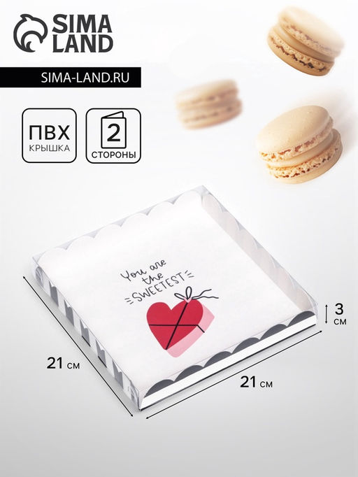 Коробка для печенья с прозрачной крышкой. Прекрасно подойдет для десертов, можно использовать для праздничного декора.Преимущества:- плотный картон;- сборная конструкция;- удобно при транспортировке. Вид упаковки: Для конфет. Вид упаковки: Для печенья. Вид упаковки: Для макарун. Форма: Квадратная. Плотность, г/м?: 250. Длина, см: 21. Ширина, см: 21. Высота, см: 3. Тематика: С сердечками. Вид упаковки: Картонная упаковка. Тематика праздника: Универсальная тематика. Тематика праздника: День рождения. Тематика праздника: 14 Февраля. Вид: Упаковка для маффинов/макарони. Вид: Универсальные. Вид: Кондитерские коробки. Вид еды: Для десертов. Вид еды: Универсальный. Вид еды: Для печенья. Вид: Складные коробки. Наша разработка: Да. Размеры товара: 21/3/21.