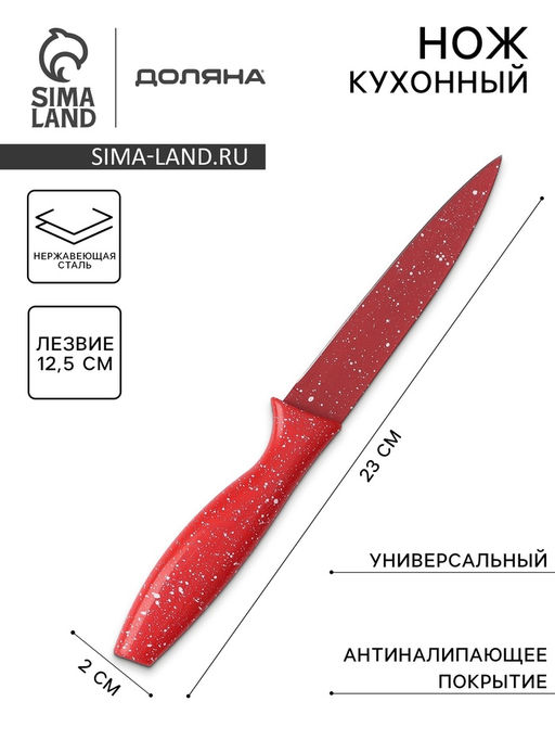 Нож с антиналипающим покрытием станет отличным подспорьем в готовке для каждого увлечённого повара.Чем он хорош?Антиналипающее покрытие сокращает время готовки.Надёжная сталь обеспечивает длительный срок службы и высокую прочность.Изделие не впитывает посторонние запахи, не вступает в реакции с продуктами.Нож легко моется, требует минимального ухода.Удобная ручка предохраняет руки от усталости.Яркий дизайн выгодно отличает нож от морально устаревших моделей.Правила ухода:перед первым применением нож необходимо тщательно промыть в горячей воде с добавлением чистящего средства;производите чистку ножа после каждого использования;не используйте абразивные моющие средства и металлические губки;перед тем, как убрать нож на хранение, обязательно протрите его сухим полотенцем.Внимание: лезвия ножей очень острые! Храните ножи в недоступном для детей месте. Набор: Нет. Длина лезвия, см: 12.5. Рисунок: Нет. Тип покрытия: Антиналипающее. Тип ножа: Универсальный. Размеры товара: 2/3/23.