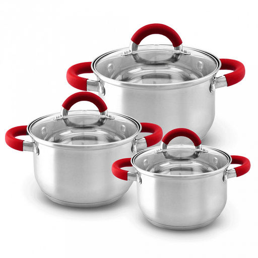 • Набор посуды из нержавеющей стали "Kelli" 6 предметов: кастрюля 1,9л, д16см, 2,6л, д18см, 3,6л, д20см, стеклянная крышка, пароотвод, капсульное дно, силиконовые ручки, цветная коробка (Китай) Подходит для всех видов плит, включая индукционную.