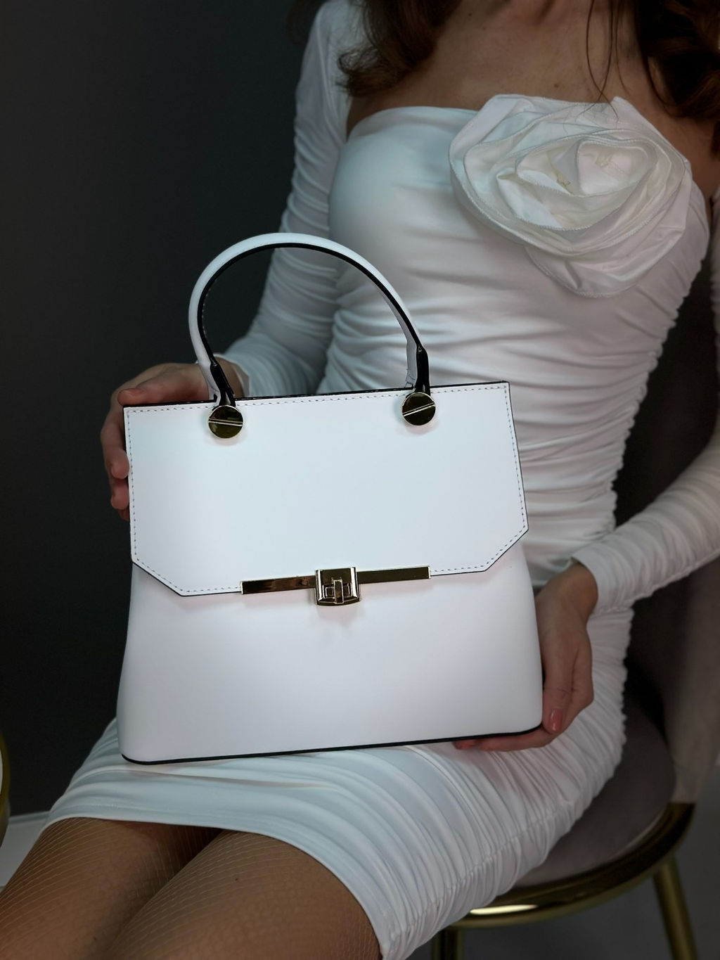Страна: Италия Акции: Товары со скидкой Производитель: Pelletteria Luisa, Italy Размер: средняя Стиль ношения: короткие ручки в руках Форма: жесткая Выделка кожи: гладкая матовая Цвет кожи: Белый Оттенок: белый матовый Палитра цветов: TB-307708 Matte Размеры: длина: 27 см \tвысота: 23 см \tширина: 12 см \tвысота ручки: 10 см \t Описание: \t Элегантная женская сумка из натуральной кожи, производство Италия. Коллекция Весна-Лето 2023, Sefaro. Небольшая стильная сумочка жесткой каркасной формы, выполнена из телячьей кожи шелковистой гладкой матовой выделки Matte. Украшением модели служат большие болты-крепления ручки и изящная пряжка-застежка на лицевой части. Сумка легко сочетается с вещами в стиле Casual, будет органично смотреться в классическом, деловом либо повседневном образах. Закрывается внахлест на защелку, внутри 2 отделения, разделенных карманом-перегородкой на молнии, на боковых стенках имеется 1 карман на молнии и 2 накладных тканевых кармашка для мелочей. Внутренняя отделка сумки - качественная, водоотталкивающая, приятная на ощупь и долговечная в использовании, ткань. В модели используется качественная итальянская фурнитура в золотом цвете. На дне сумки имеются защитные металлические ножки. В комплекте идет плечевой кожаный ремешок, длиной 95см. Сумку удобно носить в руках, на запястье или на плече очень практично и комфортно! Внутренняя отделка сумки - качественная, водоотталкивающая, приятная на ощупь и долговечная в использовании, ткань.