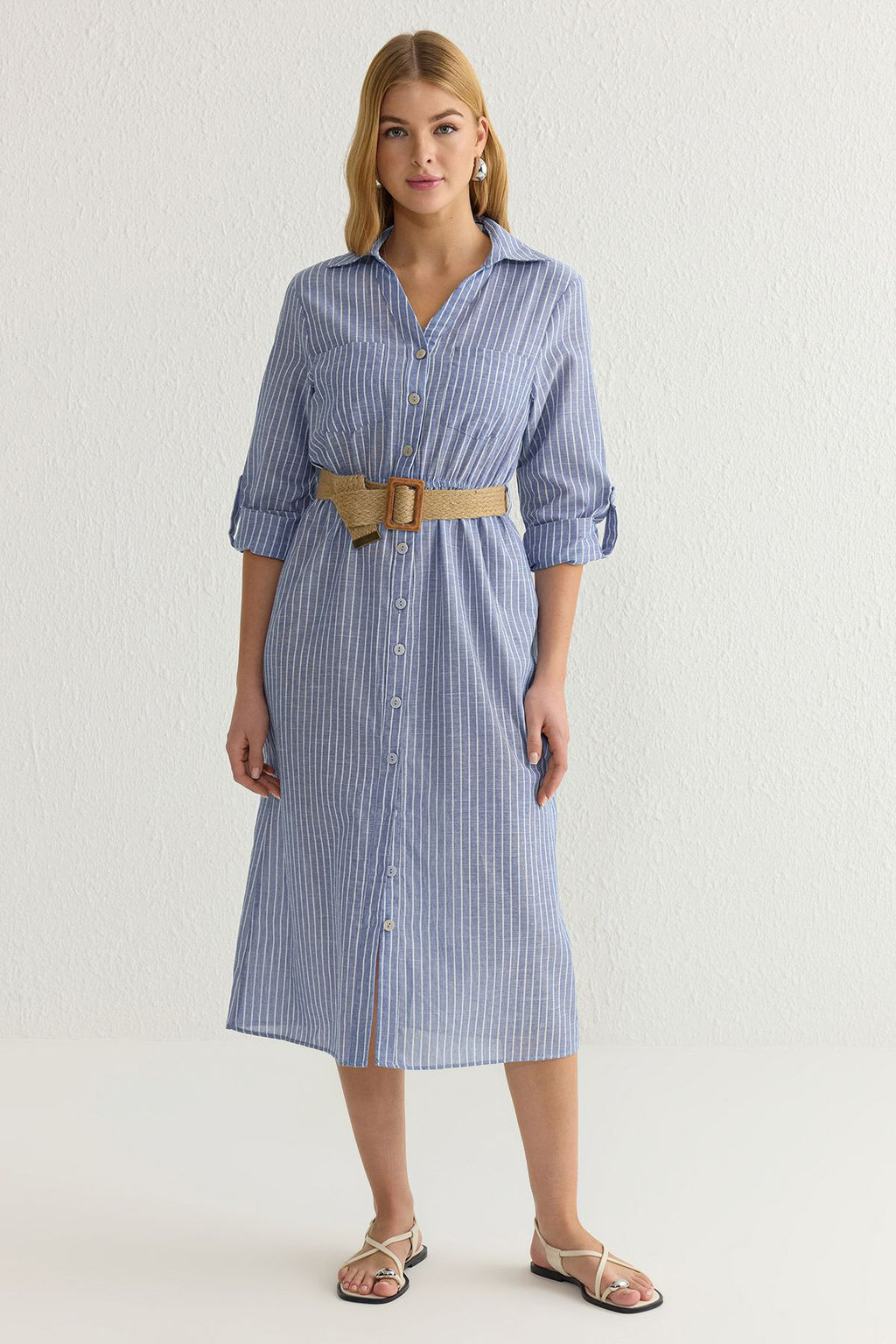 • Mavi Kemerli Cizgili Midi Dokuma Gomlek Elbise TWOSS25EL00063