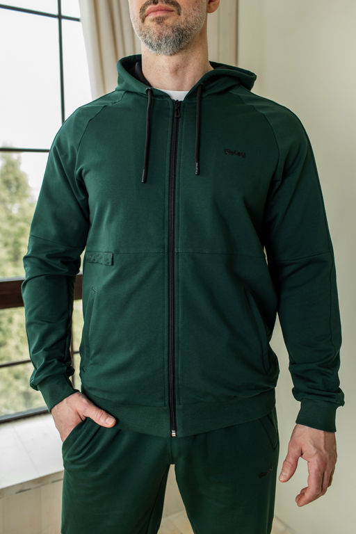 Верх — толстовка на молнии с капюшоном. Рукав реглан создаёт мягкую линию плеч и обеспечивает свободу движений. Боковые карманы на молнии практичны и аккуратно вписаны в дизайн. Манжеты на рукавах и по низу изделия помогают сохранить форму и обеспечивают комфортную посадку.Особое внимание привлекает — лаконичная вставка с тиснёным логотипом, добавляющая модели оригинальности и подчёркивающая современный характер.