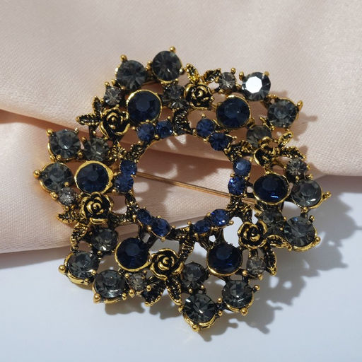 Брошь «Императрица» круг с розами, серо-синяя в чернёном золоте