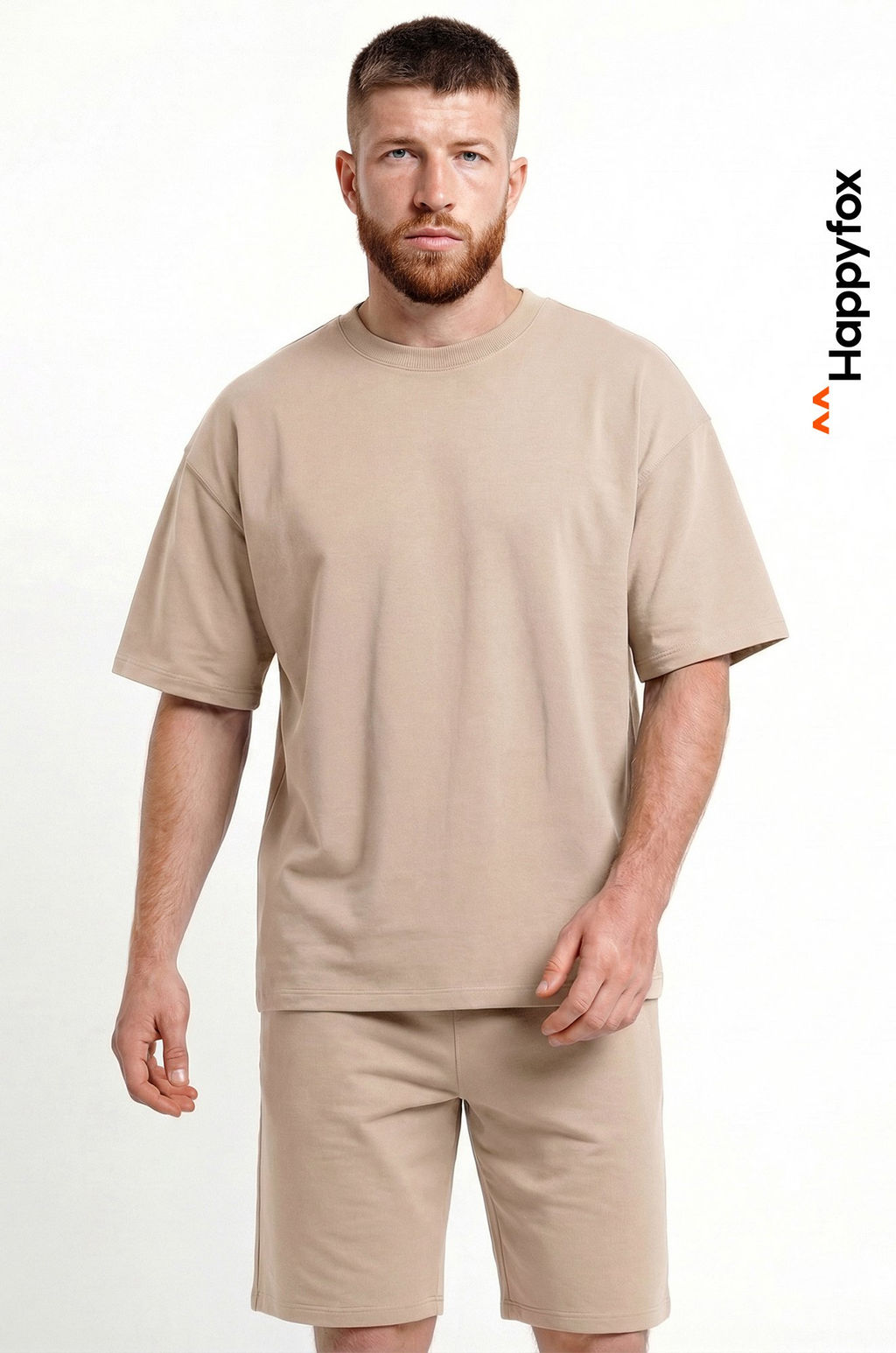 Мужской костюм двойка стильный и комфортный вариант на каждый день. Трикотажный костюм с футболкой и шортами отлично подойдёт для прогулок и активного отдыха, сочетая удобство и молодежный стиль. Преимущества: спортивный костюм для мужчин выполнен из хлопкового трикотажа футера с добавлением лайкры (плотность 240 г/м2); натуральный хлопок приятен к телу, материал дышит и обеспечивает комфорт; трикотажный костюм двойка включает свободную футболку оверсайз и удлиненные шорты; расслабленный крой футболки со спущенным плечом подчёркивает стильный силуэт; шорты на эластичном поясе со шнурком позволяют отрегулировать посадку; боковые карманы делают костюм ещё удобнее для повседневного использования. Однотонный бежевый костюм с шортами универсальный вариант для дома, прогулок, тренировок и активного отдыха. Лёгкий и стильный летний костюм для мужчин практичное решение на лето. Размер 48: футболка: длина:71 см; ширина:57 см. шорты: длина :55 см; ширина по бедрам:55 см. Размер 50: футболка: длина:74 см; ширина:58 см. шорты: длина :56 см; ширина по бедрам:56 см. Размер 52: футболка: длина:76 см; ширина:60 см. шорты: длина :57 см; ширина по бедрам:58 см. Размер 54: футболка: длина:78 см; ширина:63 см. шорты: длина :58 см; ширина по бедрам:59 см. *замеры выборочные, могут незначительно отличаться. Состав: 70% хлопок, 25% полиэстер, 5% лайкра Видео https://img0.happywear.ru/videos/H/F/HF4414_бежевый_video.mp4