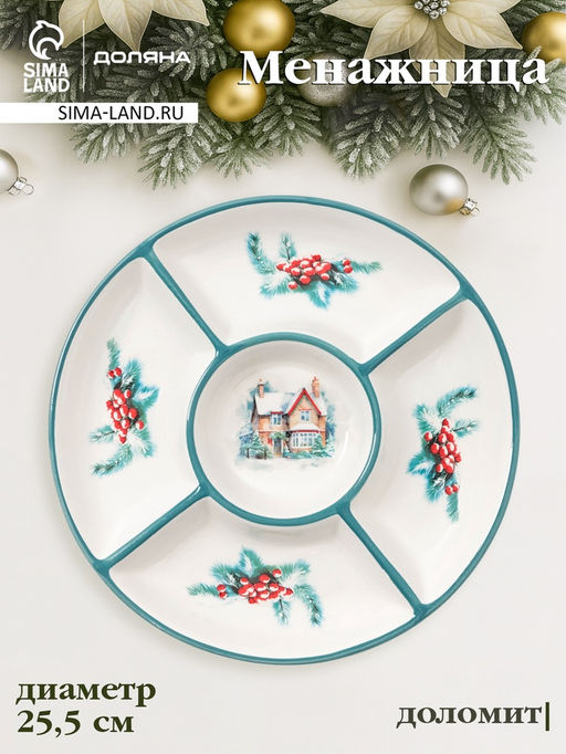 Создайте атмосферу зимней сказки на вашем праздничном столе с изысканной «Менажницей Зимний Вечер». Эта круглая многоярусная закусочная тарелка изготовлена из качественного белого керамического доломита и украшена новогодним рисунком, который привнесёт уют и стиль в ваше приготовление блюд. Классический белый цвет делает её идеальным дополнением для любого интерьера, добавляя всплеск праздника и элегантности.Продуманная конструкция Пять просторных секций позволяют организовать разнообразные угощения, от канапе до сладостей, без перепутывания вкусов. Материал — керамика (доломит) известен своей прочностью и устойчивостью к царапинам, что делает его надежным решением для частого использования. Изделие специально создано для хранения и подачи съедобных деликатесов, добавляя гармонию и изысканность к любому событию. Тарелку нельзя мыть в посудомоечной машинке, поэтому рекомендуется ручное мытьё для сохранения её первозданного вида.Идеально для праздничного сезонаУкрасьте ваш стол, став частью уютных зимних вечеров вместе с «Менажницей Зимний Вечер». Это не просто аксессуар, а элемент, который добавит частичку нежности и волшебства в вашу праздничную трапезу, подчёркивая важность момента. Набор: Нет. Количество ячеек: 5. Тематика: Новогодняя. Рисунок: Да. Можно мыть в посудомоечной машине: Нет. Бесплатная доставка: Да. Размеры товара: 25.5/3.1/25.5. Примечание: Оттенок данного товара может незначительно отличаться от фото/видеоизображения (в зависимости от настроек яркости вашего экрана)..