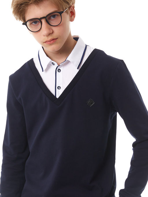 Джемпер-обманка для мальчика из трикотажного полотна и текстиля с длинными рукавами на манжете. прямого силуэта, с отложным воротником на стойке из текстиля. Отделка воротника и планки застежки из ткани контрастного цвета. Состав:92% хлопок, 8% лайкра