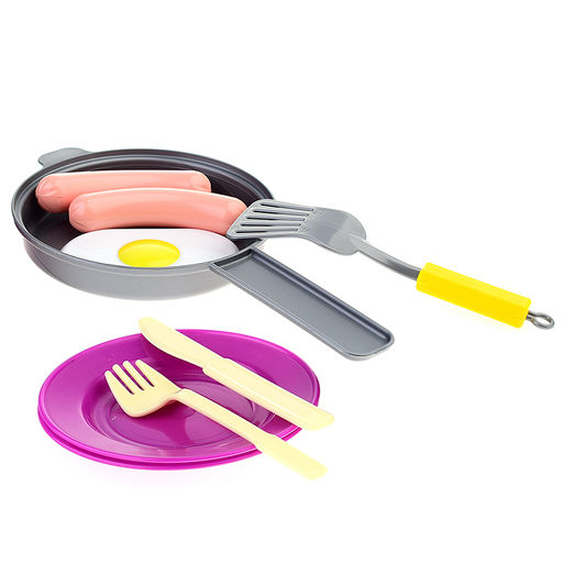 Комплектация: сковорода с крышкой 1 шт., тарелка десертная 2 шт., вилки 2 шт., нож 2 шт., лопатка 1 шт., сосиски 2 шт., яичница 1 шт.