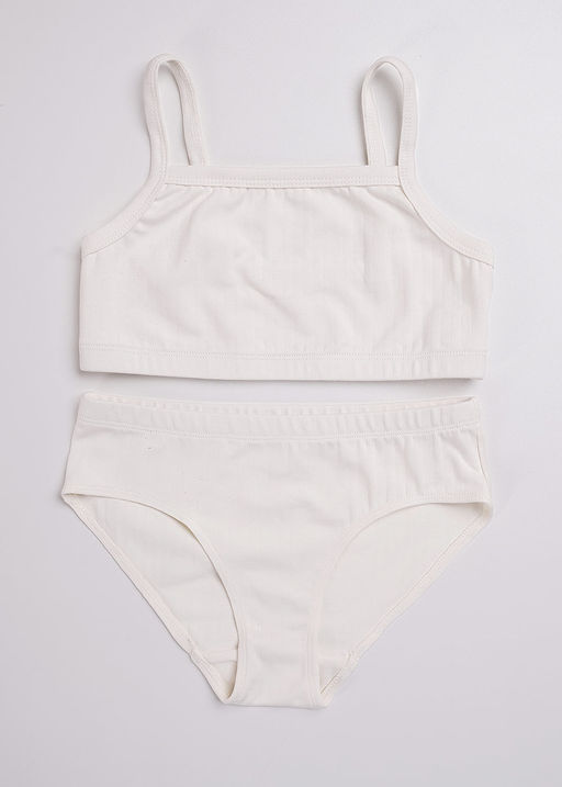 Нежный детский комплект белья в молочном оттенке: мягкий топ и удобные трусики из приятной хлопковой лапши. Натуральные материалы и продуманный крой обеспечивают идеальную посадку и комфорт в течение всего дня. 95%Хлопок5%Эластан