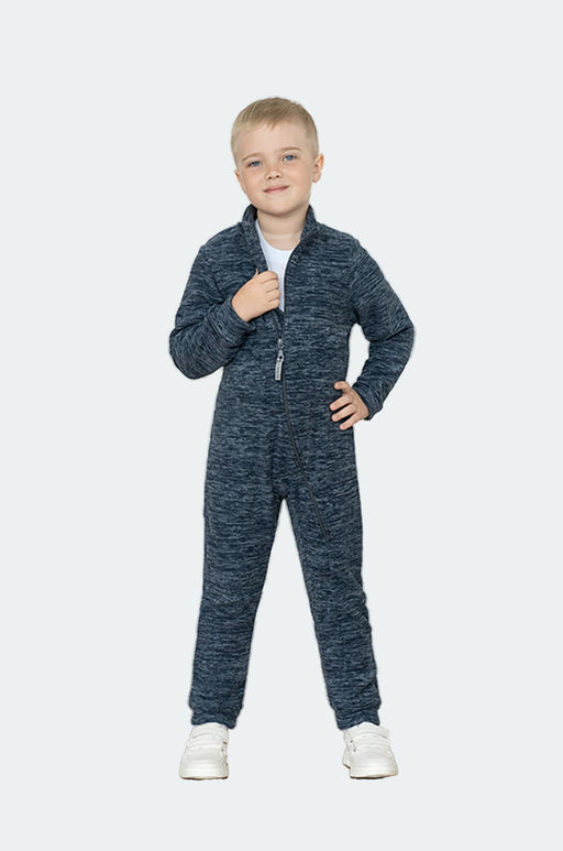 Мягкий и тёплый флис с меланжевым эффектом, хорошо сохраняет тепло, не электризуется. Особенности модели: комбинезон однотонного меланжевого цвета антрацит (серый). Высокий воротник, клапан для бегунка молнии. Манжеты на рукавах и штанинах. На спине резинка для лучшего прилегания. Ассиметричная застёжка-молния уходит в ножку.
