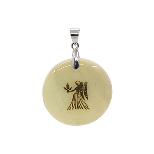 Круглый кулон выполнен из белого перламутра с золотистым рисунком знака зодиака Дева. Диаметр кулона 30мм.