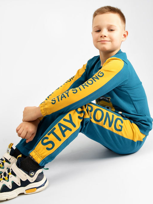 Спортивный костюм для мальчика из натурального хлопка - футера 2-х нитки. Кофта с принтом, брюки на широком эластичном поясе с кулиской, брючины на манжете. Стильный, удобный костюм подходит для прогулок и активного отдыха.