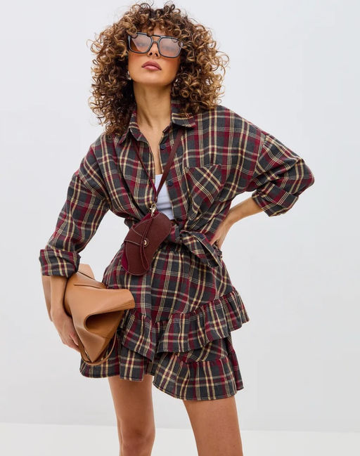• K12596 Костюм: рубашка и юбка OVER SIZE, хлопок БОРДОВЫЙ
