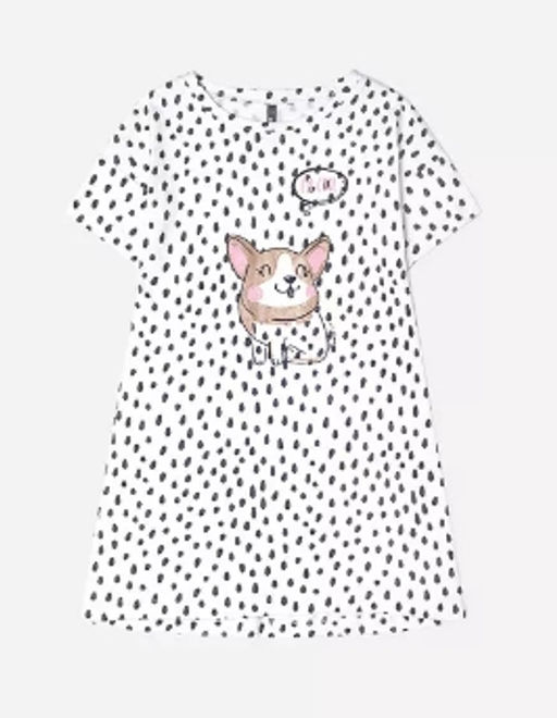 Сорочка для девочки из трикотажа интерлок с набивным рисунком. Короткие рукава со спущенным плечом. Удлиненная спинка, скругленная по низу. Спереди принт.­