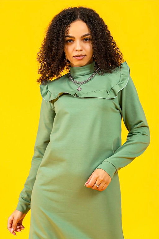 Молодежное платье-свитшот длиной выше колена, с отрезной кокеткой по линии груди, рюшей, воротником стойкой и вырезом капелькой. Идеально подойдет для составления образов в стиле Casual.­