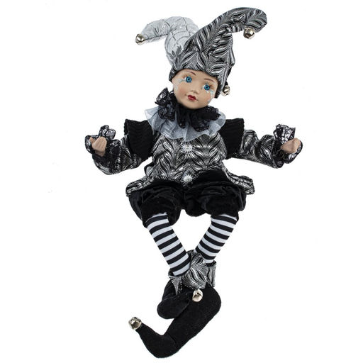Игрушка набивная "Клоун" интерсное новогоднее решение для украшения интерьера. Фарфоровое лицо клоуна выглядит очень выразительно. Одежда выполнена из нежного бархатного бархата и парчи в черно-серых тонах. Сорочка украшена двумя жемчужными поговицами, а шутовской колпак с бубенчиками и жабо на шее добавляют этой игрушке карнавальный облик. Гибкие руки и ноги куклы позволяют создавать различные позы, что делает его еще более живым и привлекательным элементом декора.
