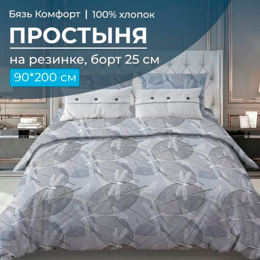 Артикул: Простыня на резинке 090*200 см, бязь "Комфорт 150 см", борт 25 см (Стрекозы, серо-бежевый)
