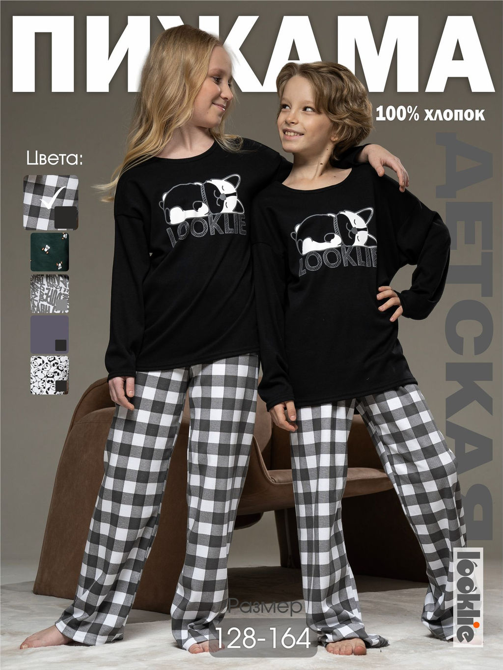 Пижама из интерлока черного цвета для девочки свободного силуэта . Состоит из толстовки и брюк . Толстовка с расширенной линией плеча, округлой горловиной и длинными рукавами. Прямые брюки с цельнокроенным поясом на резинке без бокового шва.