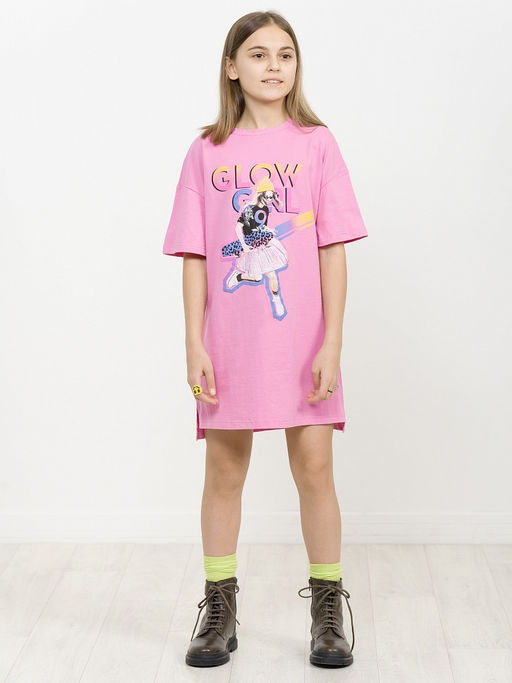 Платье футболка прямого силуэта с перепадом длины спинки и переда. Спущенный рукав с мягкой линией плеча. В боковых швах разрезы. Принт в ярких неоновых цветах с градиентом и элементами граффити. Перевод. Сияющая девушка.