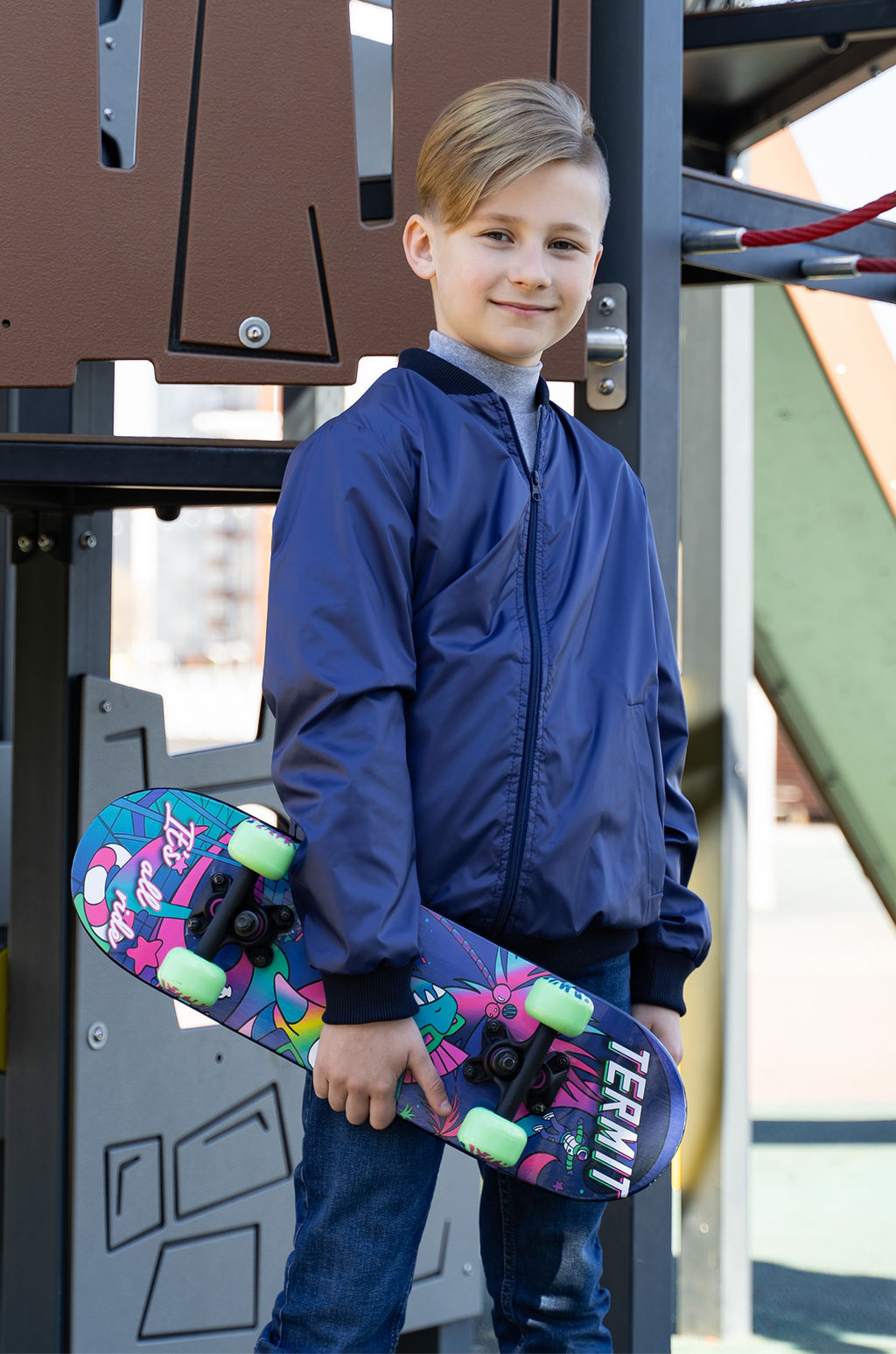 Детский бомбер (ветровка) для повседневной носки в саду и на улице. Свободный крой. Верх из ветрозащитной курточной ткани, подкладка из нежной хлопковой кулирки. Модель с двухслойными манжетами на рукавах, эластичной обработкой горловины и низа. Центральная молния-застёжка и врезные косые карманы. Приятный однотонный цвет.