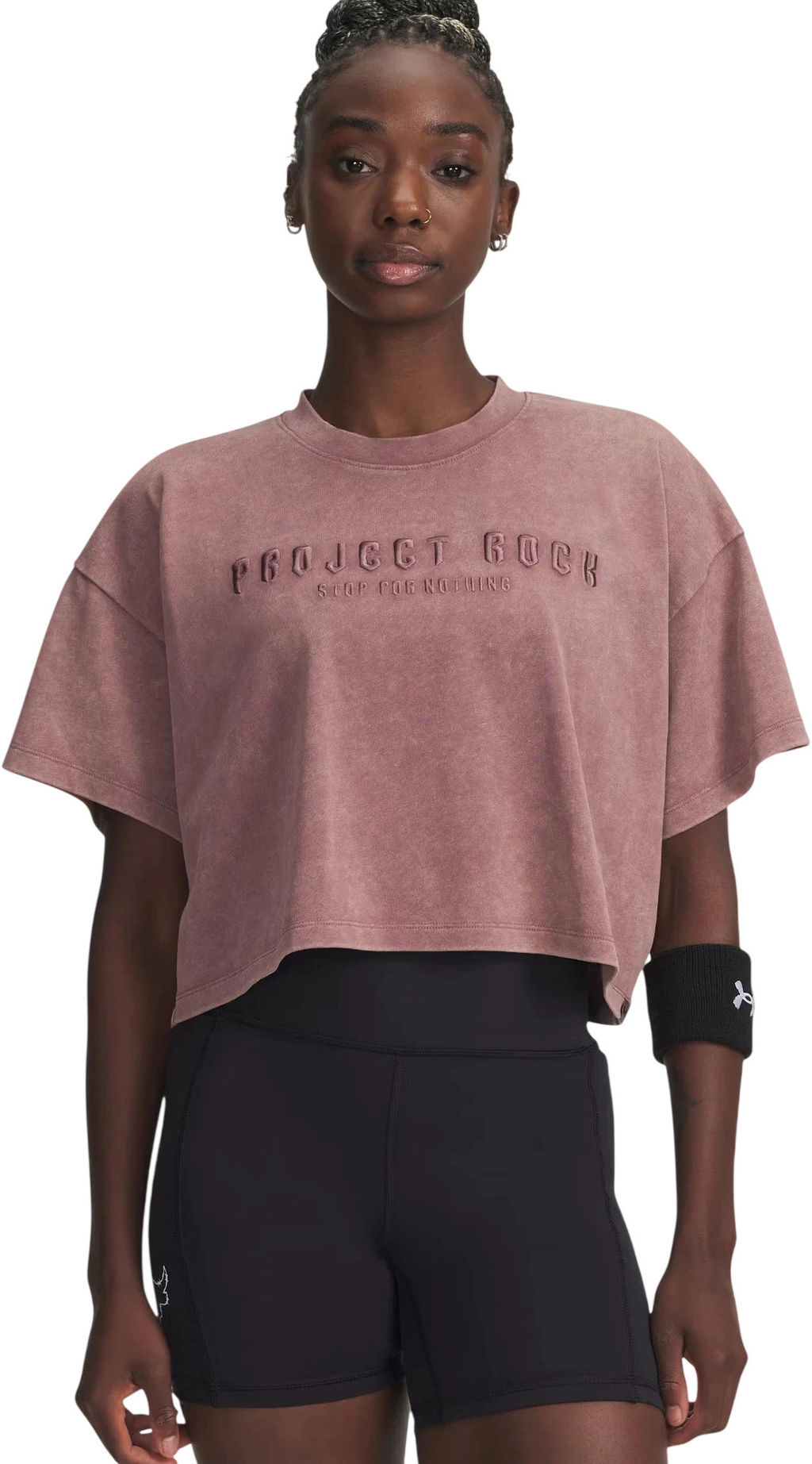 Футболка Under Armour (Project Rock Statement Graphic SS Tee) - это женская спортивная/повседневная футболка с коротким рукавом, разработанная для комфорта и стиля, сочетающая мягкость хлопка и функциональность полиэстера, идеальна для тренировок и активного образа жизни благодаря воздухопроницаемости и долговечности, с графическим дизайном.