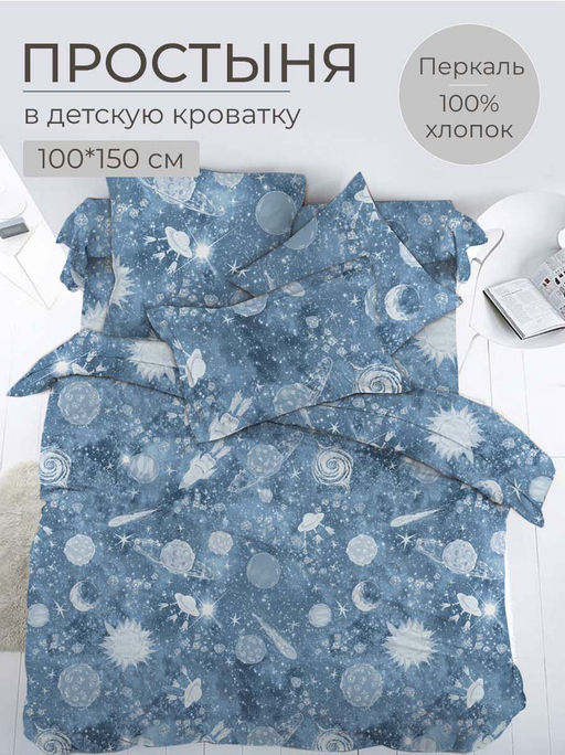 Артикул: Простыня 100*150 см в детскую кроватку, перкаль, детская расцветка (Космос)