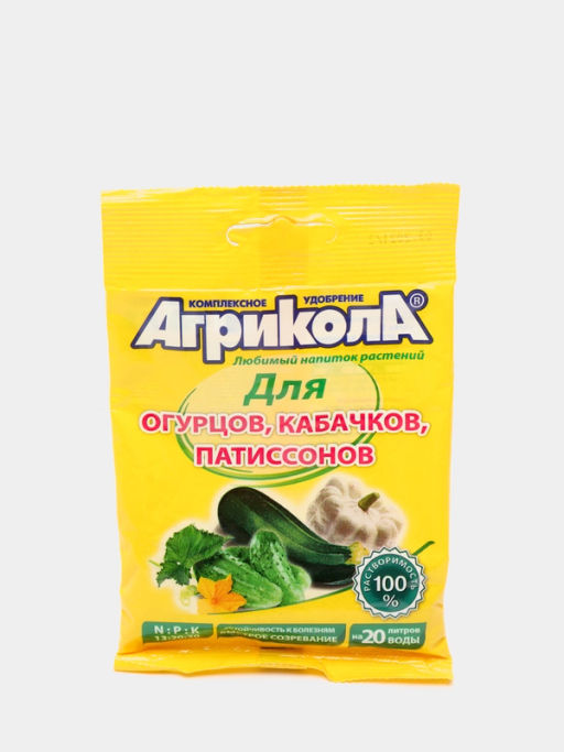 Удобрения включают полный сбалансированный набор макро- и микроэлементов, не содержат хлора и тяжелых металлов. Правильный состав, учитывающий потребности растения в тот или иной период роста, своевременные подкормки удобрениями Агрикола препятствуют образованию нитратов в растениях. Подкормка удобрением Агрикола!5. Для приготовления рабочего раствора 25 г удобрения растворите в 10 литрах воды и обработайте 10—25 кв.м посевов в зависимости от способа обработки. Огурец, кабачок, цуккини, патиссон: первая подкормка проводится в фазе появления 3-го настоящего листа при высеве культуры в открытый грунт, при рассадной культуре — через 5—7 суток после высадки рассады. Последующие обработки проводите с интервалом 7—10 дней. Всего рекомендуется провести 4—5 подкормок. Дыня: первая внекорневая подкормка проводится через 10—15 суток после высадки рассады или посева. В течение вегетации необходимо проводить не менее 2—3 внекорневых подкормок до начала плодоношения. Кроме гранулированных удобрений в комплекс Агрикола входят жидкие органоминеральные удобрения. Жидкие удобрения Агрикола в дополнение к элементам питания растений содержат гуминовые вещества (Энергены), которые благоприятно влияют на усвоение питательных веществ из почвы, а также повышают устойчивость растений к заболеваниям.