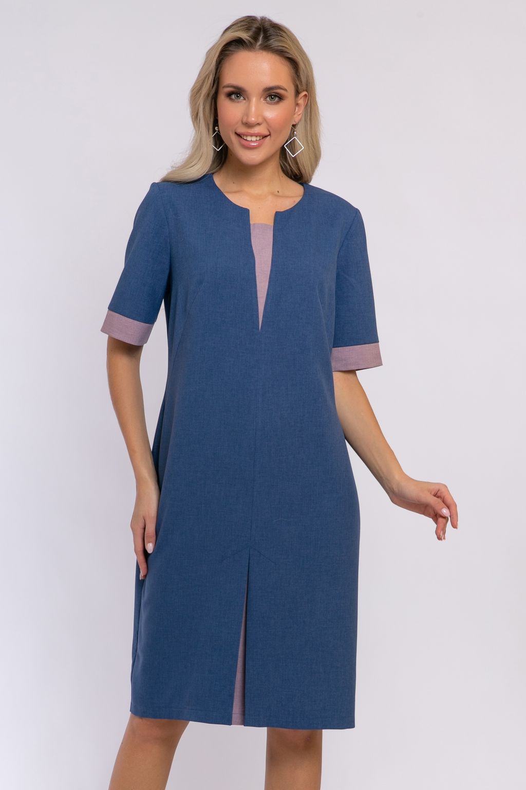 Комбинированное платье полуприлегающего силуэта из костюмной ткани. Горловина переда оформлена фигурным вырезом и дополнена треугольной вставкой из контрастной ткани. Короткие рукава втачные  дополнены притачными манжетами из контрастной ткани. Спереди модель дополнена встречной складкой с вставкой из контрастной ткани. В среднем шве спинки застежка на потайную молнию.­