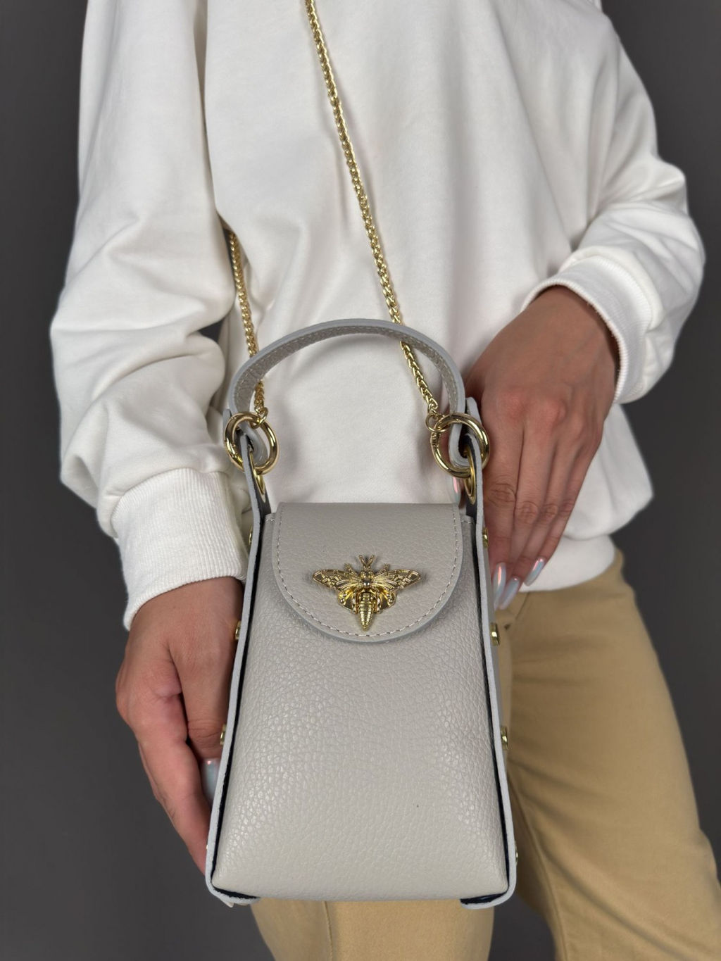Страна: Италия Акции: Товары со скидкой Производитель: Pelletteria Luisa, Italy Размер: маленькая Стиль ношения: на ремешке через плечо Форма: жесткая Выделка кожи: зернистая износостойкая Цвет кожи: Серый Оттенок: светло-серый Палитра цветов: TB-105944 Dollaro Размеры: длина: 13 см \tвысота: 21 см \tширина: 6 см Описание: Красивая аккуратная необыкновенно модная женская сумка кросс-боди из натуральной кожи. Тренд 2024 года, Базовая коллекция Sefaro, Италия. Особенности сумки: замок в виде золотой бабочки, плечевой ремень-цепочка, а также заклепки на боковых стенках сумки - фурнитура высокого итальянского качества. Все эти элементы непременно привлекут к вам внимание окружающих своей яркостью и оригинальностью исполнения. Сумочка имеет каркасную форму, компактная, выполнена из зернистой телячьей кожи, может использоваться как повседневная модель, но подойдет и для торжественного случая - элегантно дополнит вечерний образ по типу клатча, либо подчеркнет сдержанный лук. Закрывается сумка на крышку с застежкой, внутри один отдел, в котором поместится всё самое необходимое. На дне сумки металлические защитные ножки. Можно носить в руке, либо на изящной цепочке через плечо (длина 110см) - очень удобно!