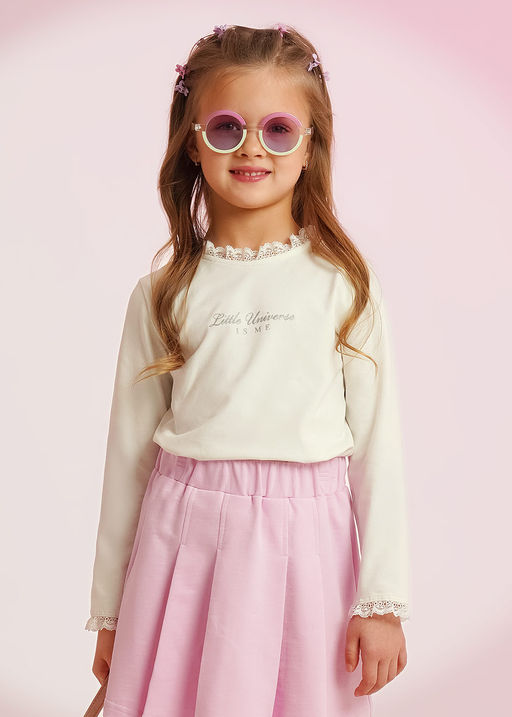 Лонгслив из хлопка с элатаном станет отличным дополнением к твоему гардеробу! По горловине и рукавам оттелка из мягкого кружева, спереди лаконичный принт. Создавай неповторимые образы с юбками и брюками из новой коллекции и будь неотразима! 92% Хлопок, 8% ПУ(эластан)