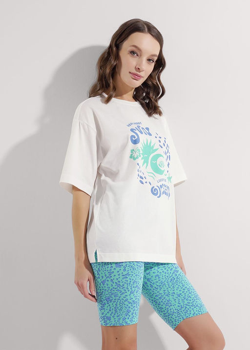 Набор одежды для дома и отдыха из трикотажного полотна. Футболка прямого силуэта из трикотажного полотна. Округлая горловина с обтачкой. Короткий втачной рукав. На полочке и спинке принт. Шорты с притачным широким поясом на резинке, принт. 100% хлопок