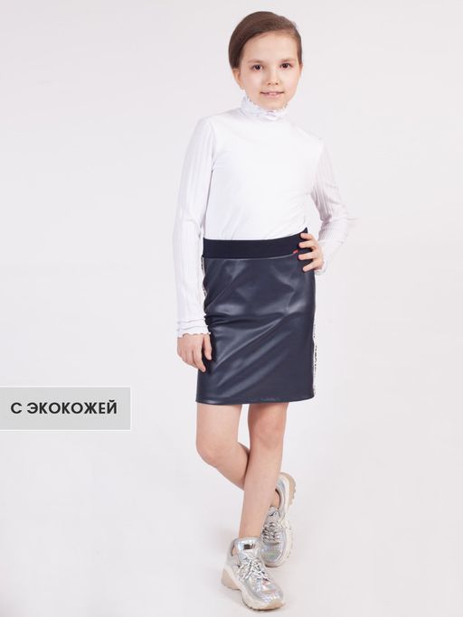 Юбка зауженая к низу, средней длины, с эластичным поясом из брендовой резины. Переднее полотнище из эко-кожи, заднее полотнище из трикотажного полотна. По боковым швам настрочены лампасы из тесьмы. В качестве дополнительного декора использованы брендовые этикетки и флажки Состав:48% хлопок, 44% полиэстер, 8% лайкра