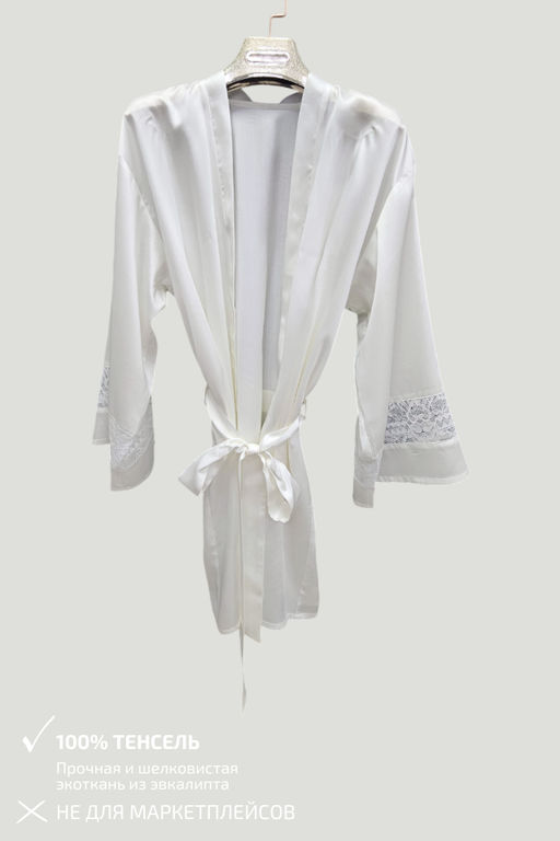 Свободный, продуманный крой красиво ложится по фигуре, формируя элегантный силуэт без лишнего объёма. Пояс на талии подчёркивает женственные линии, позволяя регулировать посадку, а кружевные вставки на рукавах добавляют образу изысканный акцент и лёгкую нотку чувственности. Каждая деталь от аккуратной обработки краёв до гармоничного сочетания текстур говорит о внимании к качеству и дизайну.