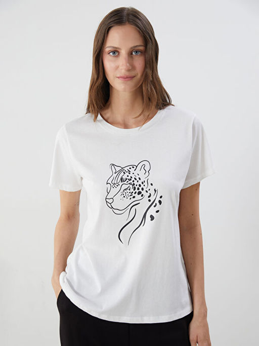 • Bisiklet Yaka Bask?l? Penye Kad?n Ti??rt