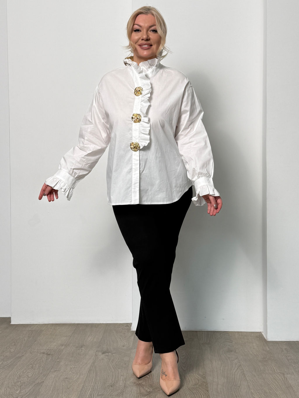 Рубашка с оборкой и стоячим воротом белая­