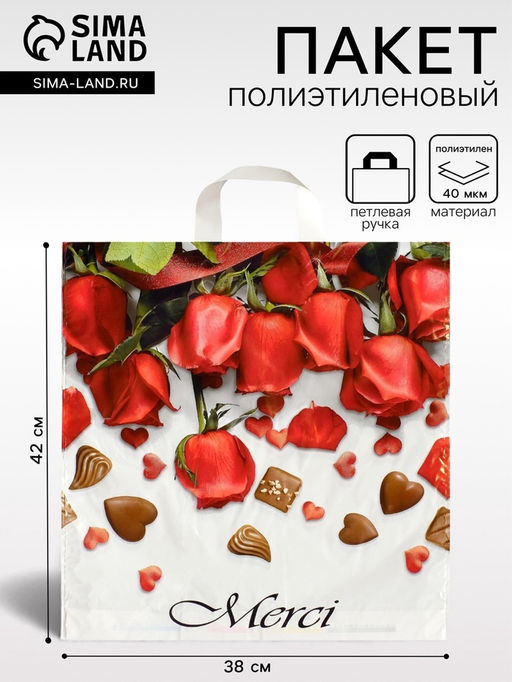 • Цена за 25 шт. Пакет Мерси, полиэтиленовый с петлевой ручкой, 38?42 см, 40 мкм